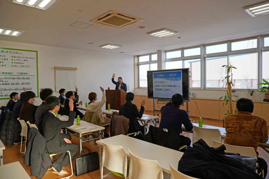 社長講話では、新たな就労A型事業所である「けんせいしゃわくワーク」の設立趣旨を説明し、「就労A型事業所の相次ぐ閉鎖による障がい者の雇用機会が減少している現状が要因の一つである。」と設立の背景について語りました。また、インバウンド需要に備え民泊のリネン類をわくワークで取り扱っていくことなど、今後の展望についてもお話ししました。