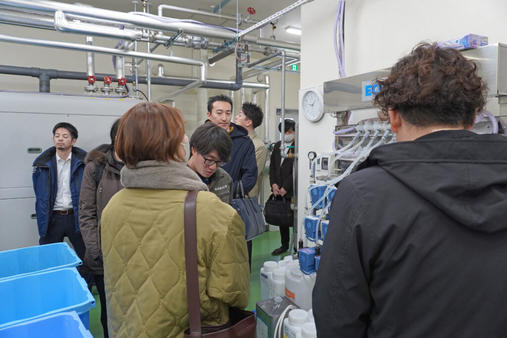 東神楽工場では、専務の瀧野から環境整備の取り組みについて説明しました。従業員に合わせ作業場所を適宜変更していくことや高温多湿である工場内の暑さ対策として使用している、ミストによる冷却装置の導入経緯などをお話ししました。