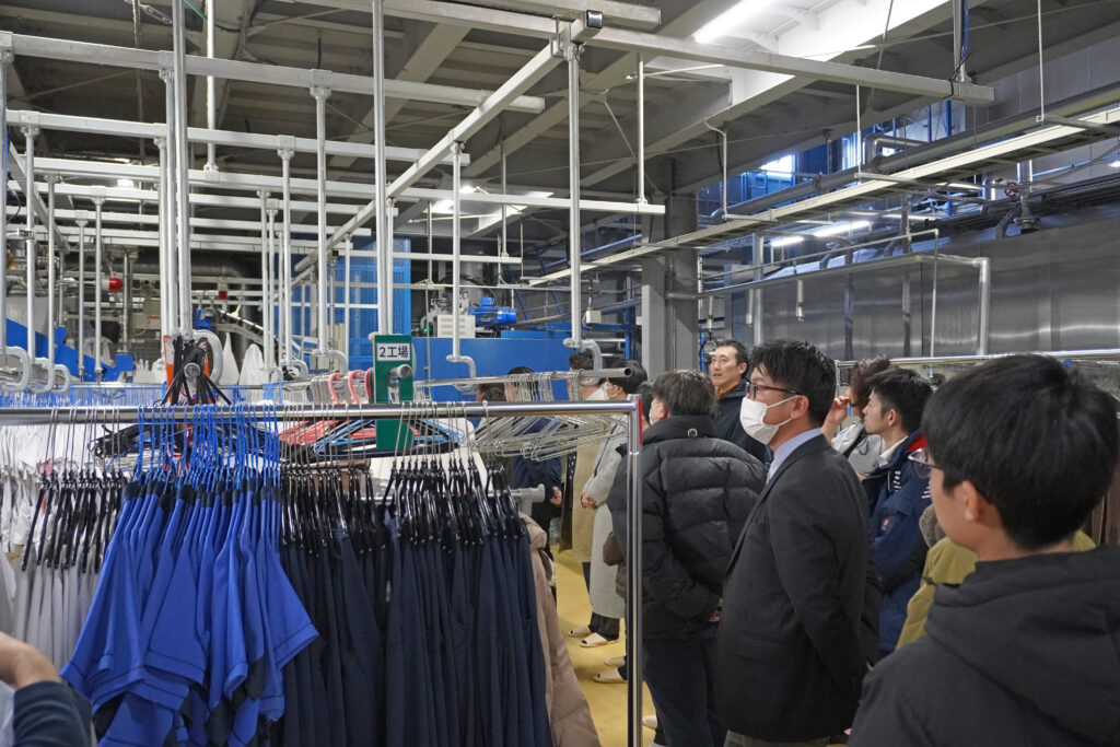 併せて、サージカルリネン専用工場では、高圧滅菌機などの専用設備や作業工程について説明しました。その後、仕上げ室を外から見学なされ、医師ごとに調整されたリネンの畳み方についてや、目視検査用LEDライトテーブルを用いた、ピンホール・異物混入を防ぐ検査体制などをご紹介しました。