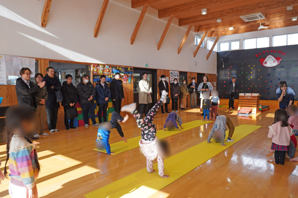 続いて、企業主導型保育施設である、おにぎり保育園では、在園児による歌や体操などのパフォーマンスに、園内は大きな歓声に包まれました。その後、北海道健誠社専務でもあり、おにぎり保育園副園長の瀧野が、園の保育方針などについて詳しく説明をしました。